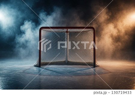 Hockey goal net on icy rink surrounded by smoke and dramatic lighting winter sports competition scene adrenaline energy vibe