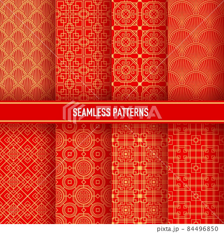 Asian seamless patterns. Korean, chinese and japanese ornaments, golden embellishments on red background. Vector traditional asian decorative textile, wallpaper, vintage oriental patterns