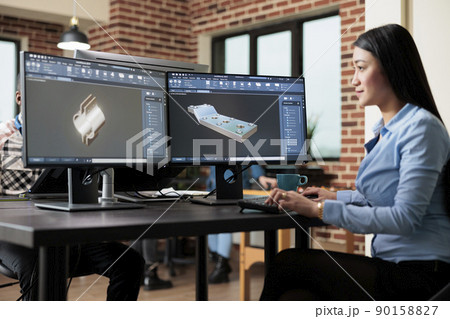 Digital creator improving prototype mesh using advanced computer and software while sketching 3D scene. Skilled creative professional creating digital model while solving technical issues.