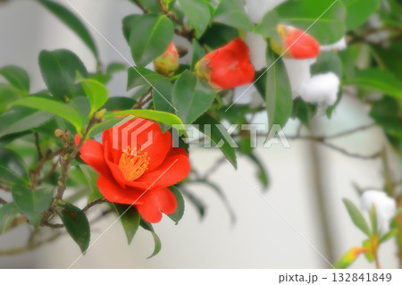 雪の中で寒さにも負けず健気に咲く山茶花の花