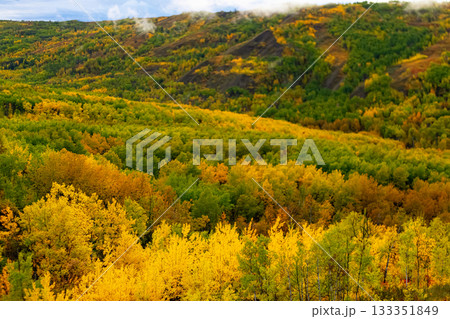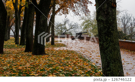 Golden Autumn in the city park. Yellow leaves on the park's avenue.