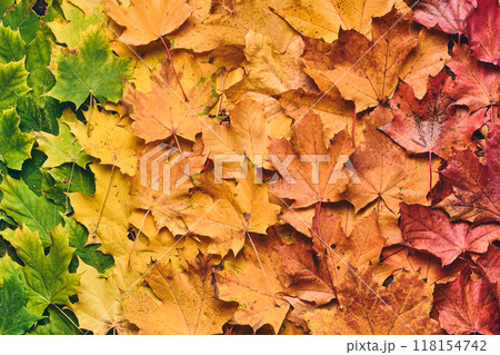 a vibrant array of wet fallen leaves covering the ground. The leaves display a rich palette of reds, oranges, and yellows, reflecting the beauty of autumn