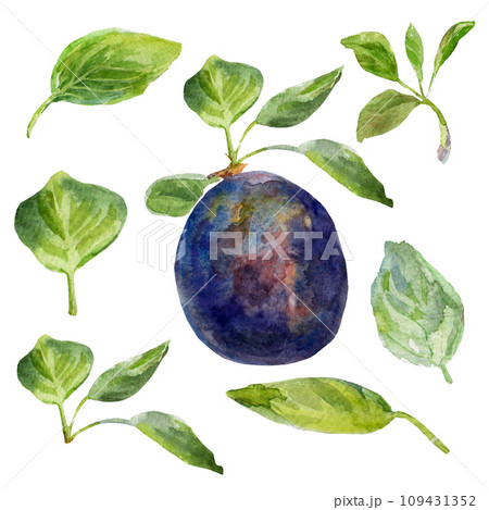 The plums leaves on an isolated set on a white background. Realistic illustration with watercolor hand drawn. Would look great on fabric, kitchen towels or food packaging