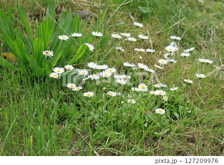 Bunch of wild daisy flowers, lat. Bellis perennis, in the lawn.