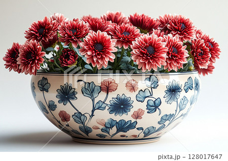 Beautiful idea and style of pink flowers in the blue ceramic vase for decorate in a home or flower shop.