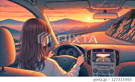 夜明けの山道を左ハンドルのセダンで運転する若く綺麗な女性