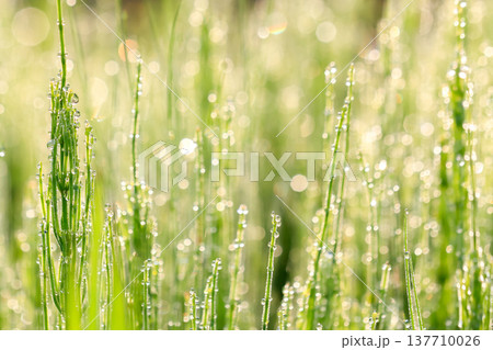 朝露に濡れる新緑の野草と光の玉ボケ