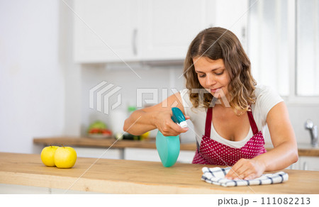 Focused young girl housewife cleaning table