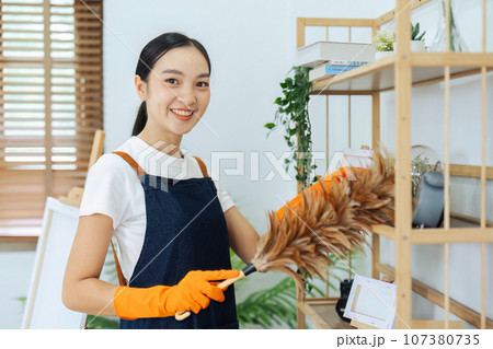 Asian young housework cleaning working in the house. The woman cleans the shelf wodd with feather duster