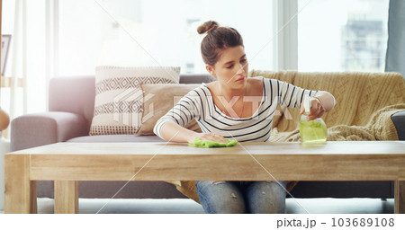 young woman cleaning and wiping wooden table with microfiber cloth. chores at home. Housekeeping