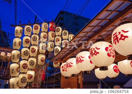 祇園祭 宵闇の綾小路通に綾傘鉾の提灯が輝く風景 京都市中京区