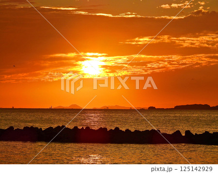 山口県下関市の綾羅木海岸の海に沈む夕陽