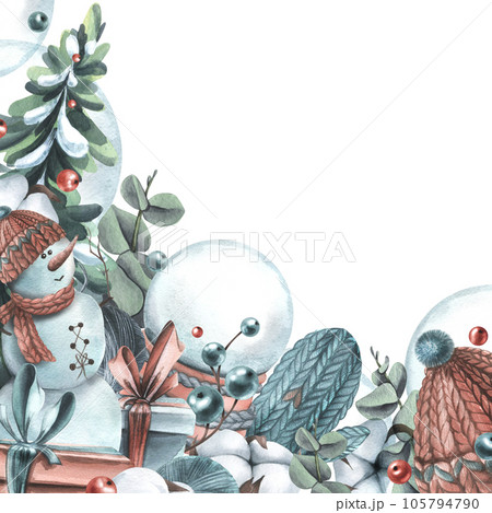 Winter, New Year, Christmas border with snowman, knitted things, cotton, Christmas balls, toys, gifts. Watercolor illustration hand drawn, template on a white background.