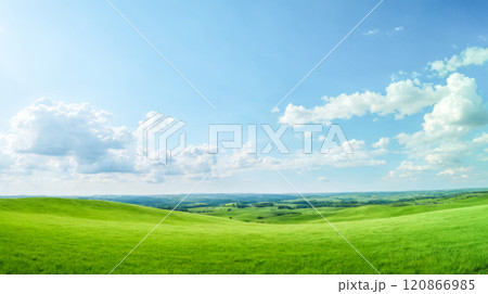 Serene Green Landscape, Rolling Hills Under Blue Sky, Fluffy White Clouds, Peaceful Nature Scenery, Open Fields, Bright Daylight, Clear Weather, Idyllic Rural View