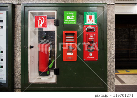 オーストリア ウィーンの地下鉄のホームにある防災設備 消火器、緊急通報システム、緊急停止システム