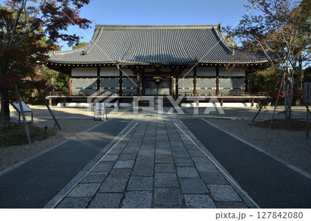 仁和寺 紅葉した並木道の参道の先にある金堂(京都市右京区)
