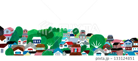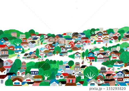 手描きイラスト 緑あふれる住宅街とそこに住む人々