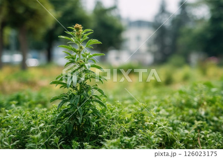 a blooming wormwood plant (artemisia) in city park, seasonal allergies (pollinosis), concept