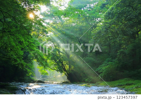 美しい光芒の出る菊池渓谷(菊池市・縦構図)