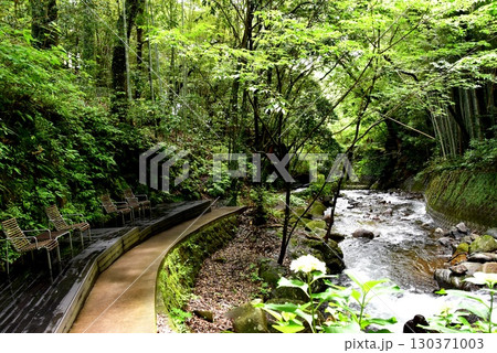 湯河原町 万葉公園湯河原惣湯の川の道とテラス席と新緑