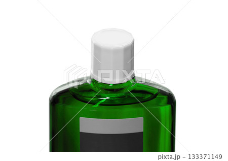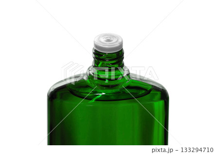 【切り抜き透過背景素材】スクリューキャップを閉めた育毛剤の緑色半透明のボトル