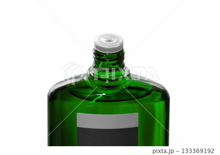 【切り抜き透過背景素材】スクリューキャップを開けた育毛剤の緑色半透明のボトル