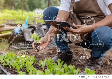Agriculture technology farmer woman holding tablet or tablet technology to research about agriculture problems analysis and visual icon.Smart farming .