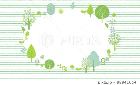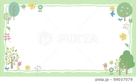 鳥や蝶が飛び回る、木と草花のフレーム 背景ストライプ