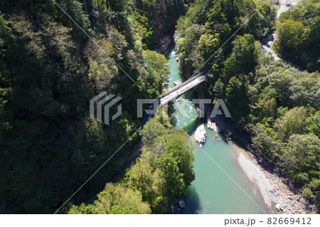 雪山と新緑の森にかかる吊り橋と清流の風景