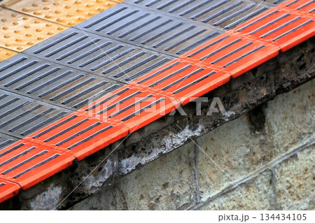点字ブロックと連動した鉄道ホームの立ち入り禁止サイン