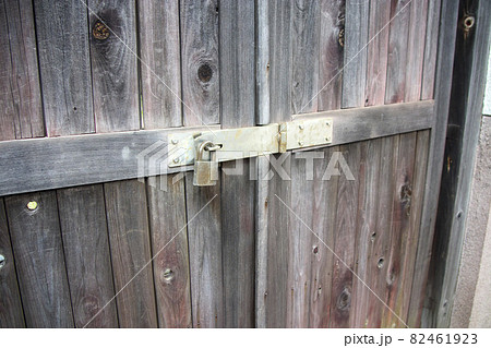 古い木製の扉の閂に付けられた錠前