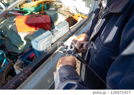 剪定鋏の止め軸をモンキーレンチで締めなおす庭師