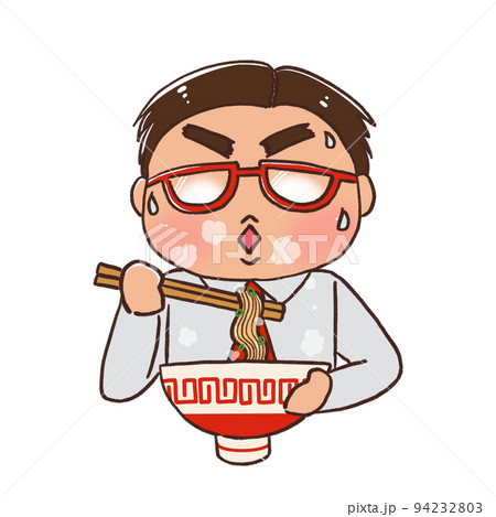 (上半身正面)熱々のラーメンを美味しそうに食べているメガネをかけたオタク