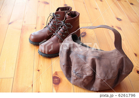 ウォシュレザーの手提げバッグとレースアップブーツ