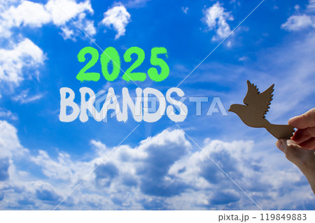 Planning 2025 brands new year symbol. Concept words 2025 Brands on beautiful blue sky. Beautiful blue sky clouds background. Hand with wooden bird. Business 2025 brands new year concept. Copy space.