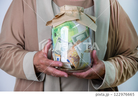 A person holds a glass jar filled with Euro and Dollar bills, with a brown paper bag tied around the top of the jar