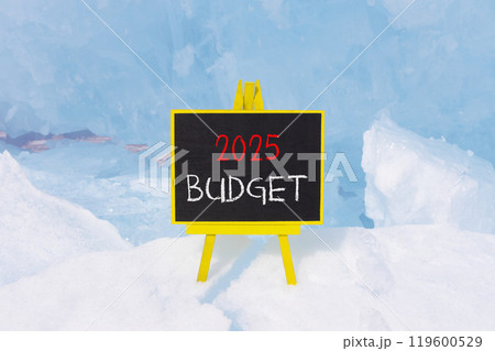 Planning 2025 budget new year symbol. Concept words 2025 Budget on beautiful yellow chalk blackboard. Beautiful Baikal lake blue ice background. Business 2025 budget new year concept. Copy space.