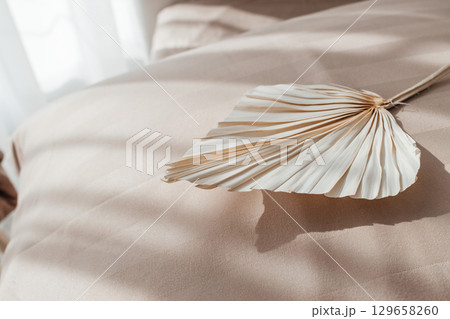 Dried palm leaf decor on beige bed linen in soft sunlight
