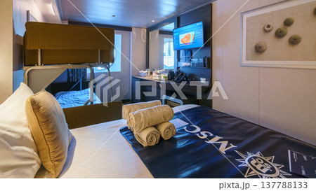 Tokyo, Japan - Oct 2 2024, panoramic view of interior of living cabin with four beds, illuminated by bedside lamps and overhead light, without people, on the MSC Bellissima cruise ship, Tokyo, Japan