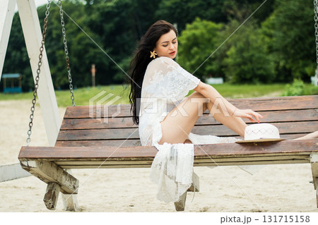 A girl with long black hair sits on a swing in the middle of a sandy beach