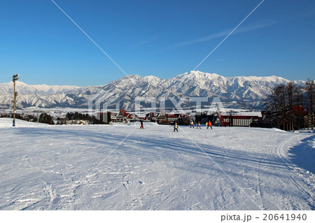 富士見パノラマリゾートのセンターゲレンデから望むセンターハウスと八ヶ岳