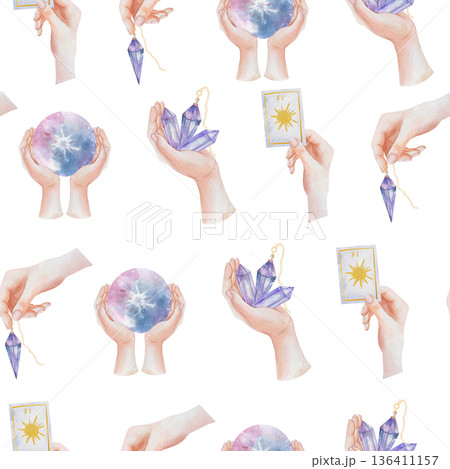 Seamless watercolor pattern with hands holding magical attributes: a crystal ball, purple crystals, a pendulum on a chain, and the Sun tarot card. Esoteric design for textiles, printing, and decor