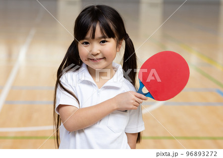 体育館にて卓球の練習をするスポーツウェアを着た日本人女性