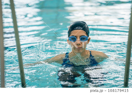 Defocused swimming pool and starting block number four 4. Text in French: depth 2 m