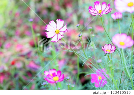 秋イメージ・ピンクの縁どりの白花コスモス(あかつき)の花一輪と蕾・ピンク和紙バック横位置