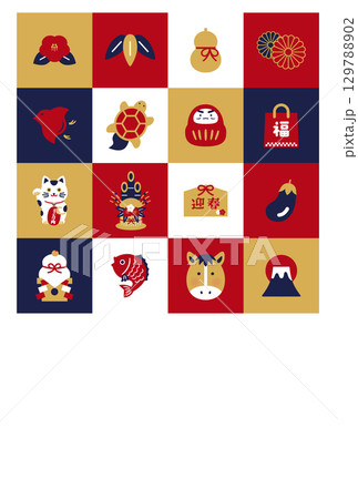 シンプルで落ち着いたデザインの年賀状 縦|赤紺金カラー・縁起物アイコン