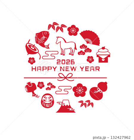 2026年 午年 縁起物の円形フレームイラスト HAPPY NEW YEAR