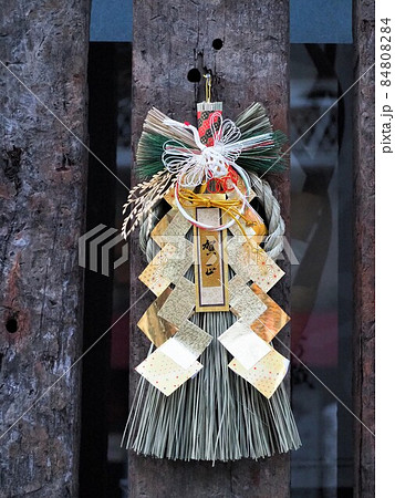 神社の大しめ縄と藁細工の伝統装飾