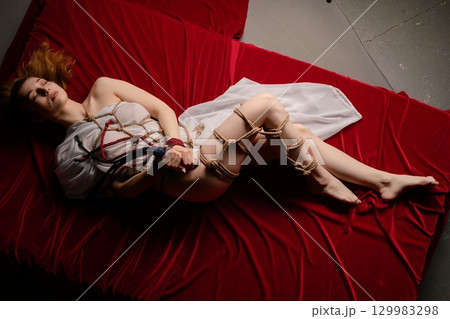 Topless woman in lingerie bound with shibari ropes on red velvet surface