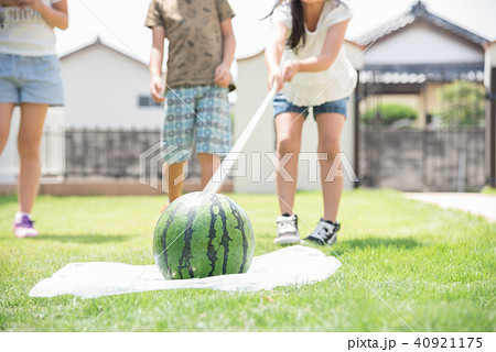 夏の海辺でスイカ割りを楽しむ家族のレジャーシーン